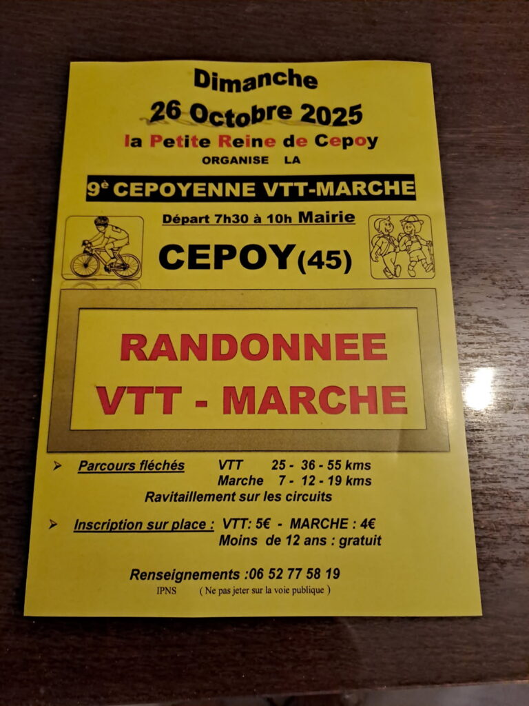 Dimanche 26 octobre, la Petite Reine de Cepoy organise la 9ème Cepoyenne VTT & marche avec des parcours de :