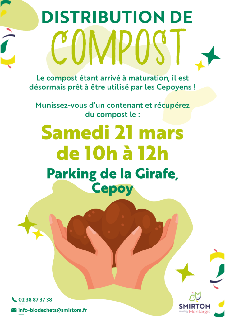 Le compost étant arrivé à maturation, il est désormais prêt à être utilisé ! Il sera distribué aux Cepoyens qui le souhaitent le samedi 21 mars entre 10h et 12h sur le parking de la Girafe.