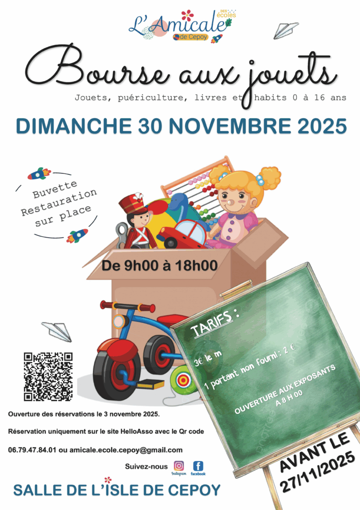 L’Amicale des écoles de Cepoy vous invite à faire du tri dans les chambres des enfants (et parfois même dans toutes les pièces de la maison qui se transforment en salle de jeux) mais également de dénicher de nouveaux jouets pour Noël ou autre.